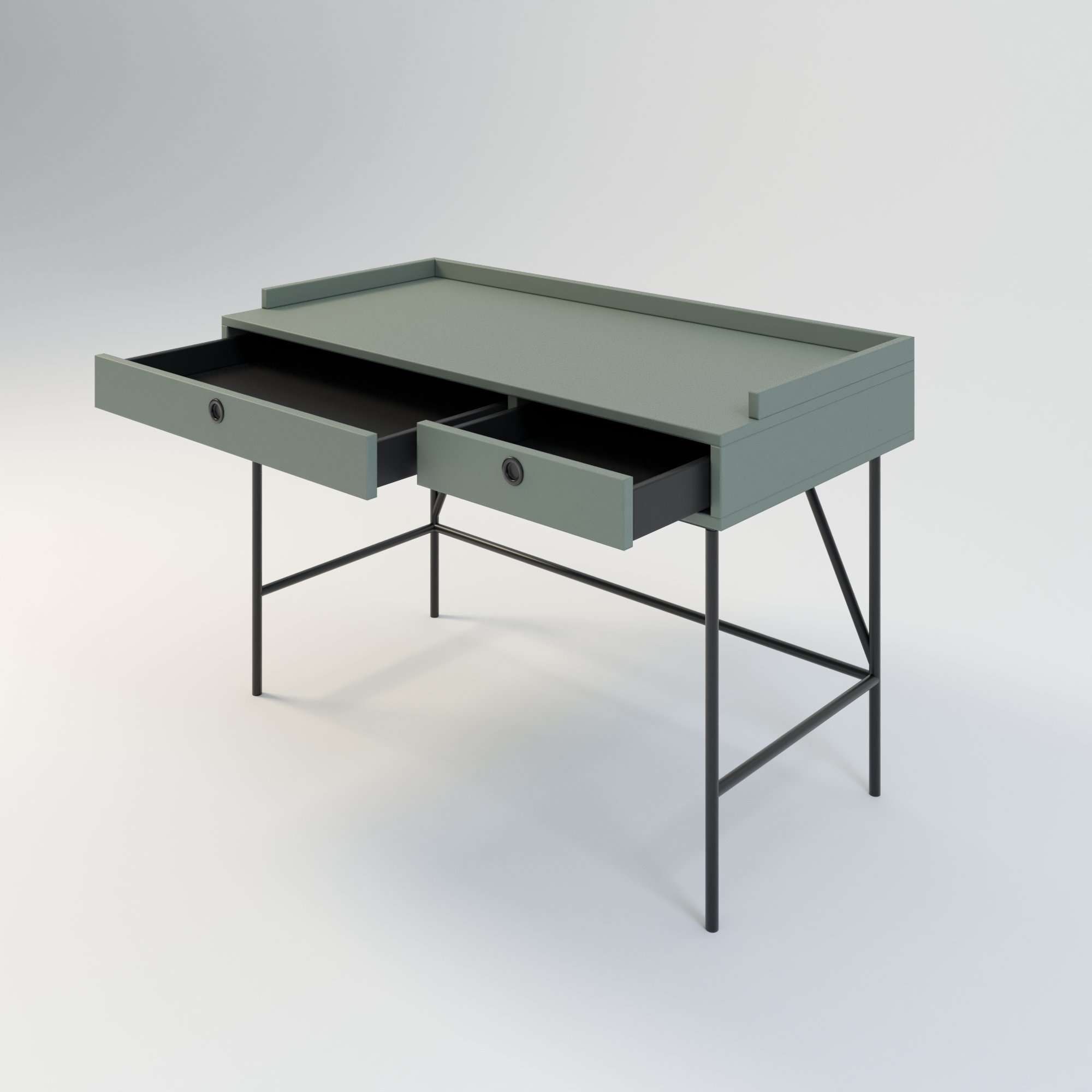 Biurko w stylu minimalistycznym. Zaprojektowane z myślą o osobach ceniących sobie prostotę i elegancję. Posiada 2 funkcjonalne szuflady. Wykonane w całości z wysokiej jakości płyty laminowanej w kolorze zielonym eukaliptusowym. Kolor ten doskonale sprawdza się połączeniu z innymi kolorami.