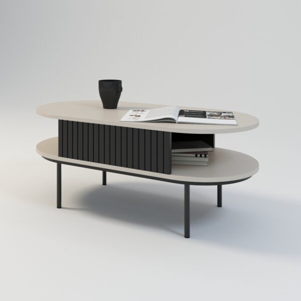 Die schwarzen Seiten und die dezenten Latten verleihen dem Tisch eine unverwechselbare, elegante Optik. Er ist nicht nur ein Latten-Couchtisch, sondern auch ein praktisches Ablagefach – ideal für Zeitschriften, Fernbedienungen oder Dekoartikel. Als ovaler Couchtisch in Schwarz fügt er sich perfekt inklassischen, modernen und skandinavischen Einrichtungsstil ein.