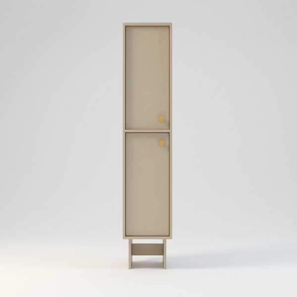 Ein Badezimmerschrank im Japandi-Stil. Entworfen für alle, die Wert auf Schlichtheit und Eleganz legen, sind die Türen in den Korpus eingelassen und mit ausfallsicheren Scharnieren ausgestattet. Sie lassen sich wahlweise links oder rechts öffnen. Das funktionale Design bietet viel Stauraum. Der Schrank ist vollständig aus hochwertigem Laminat gefertigt. Die Höhe des Korpus beträgt 175 cm, die Füße 25 cm.