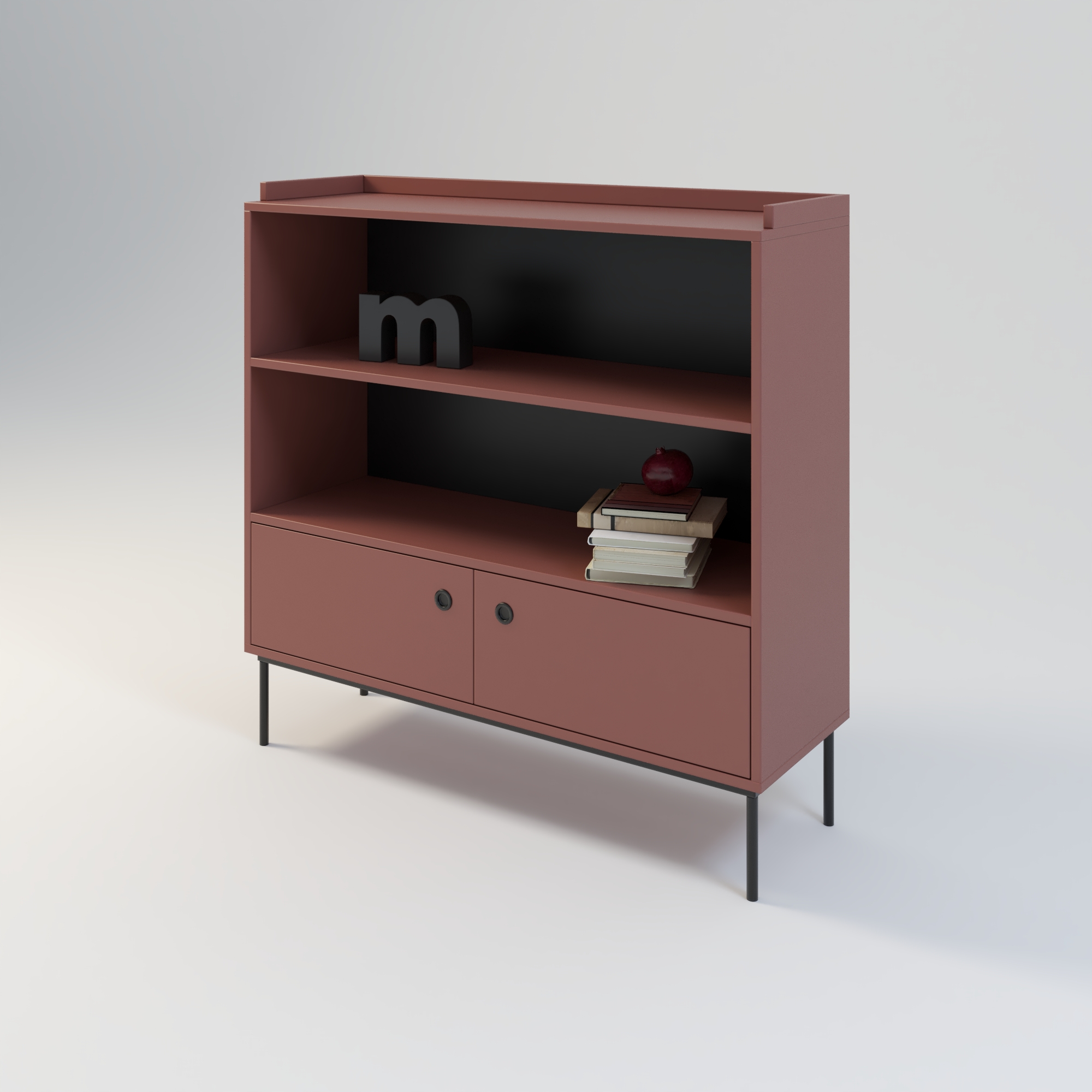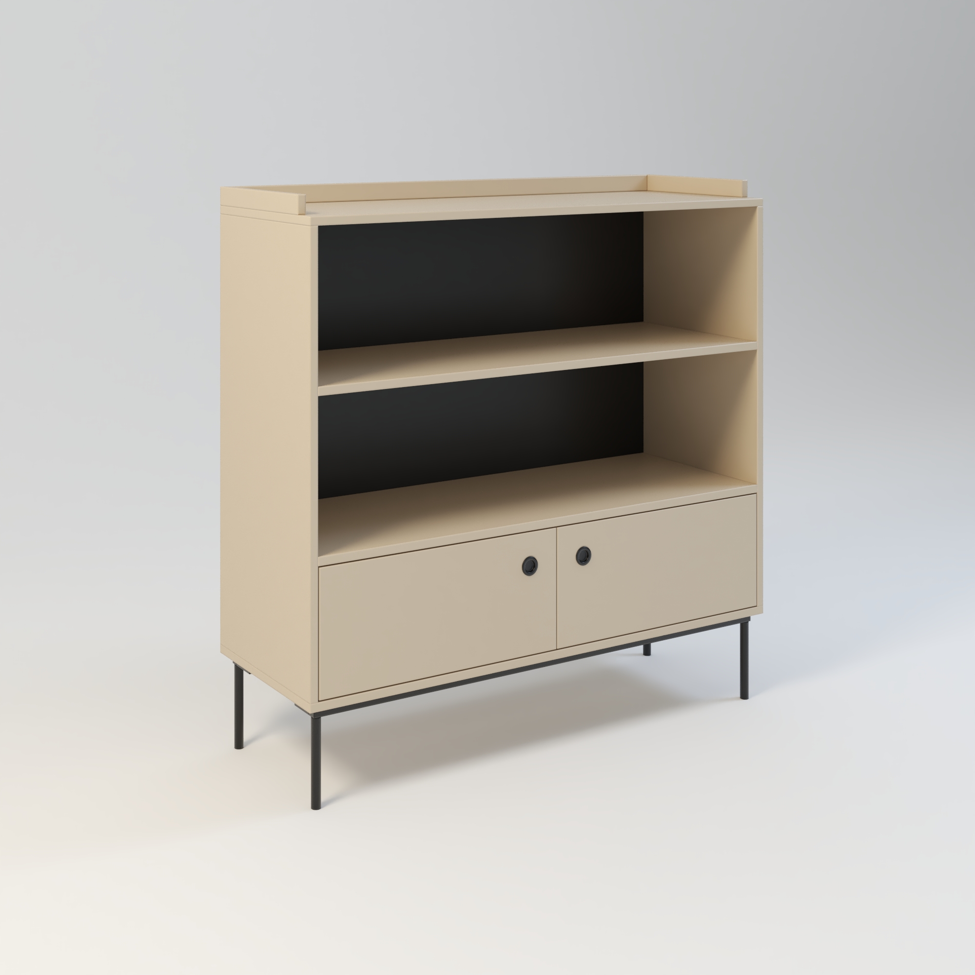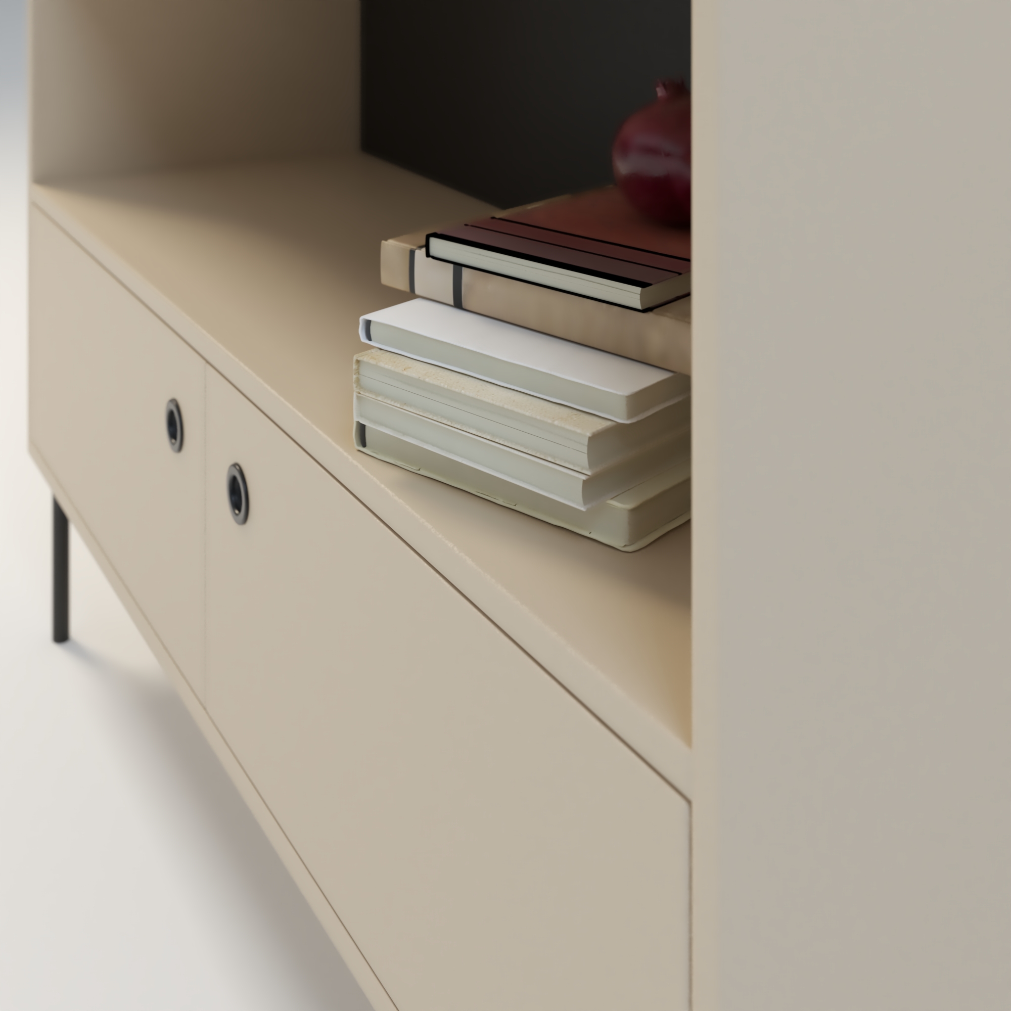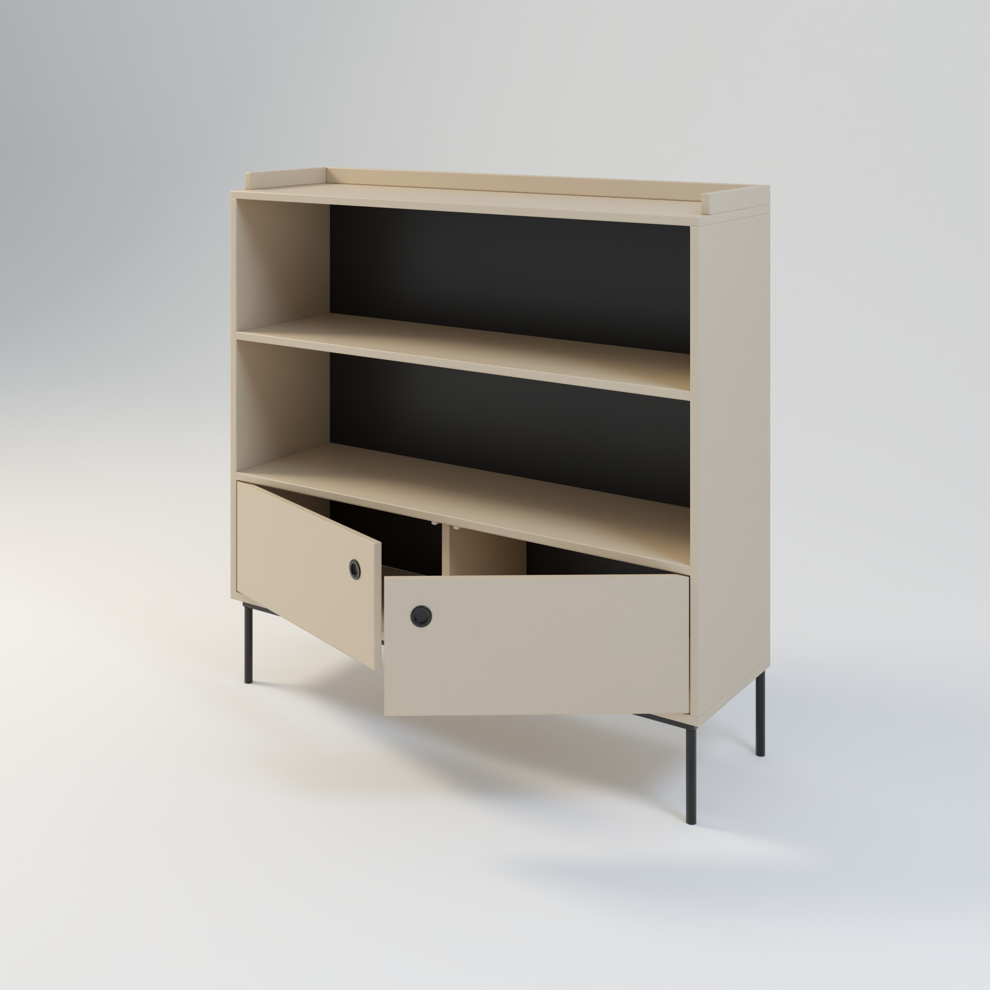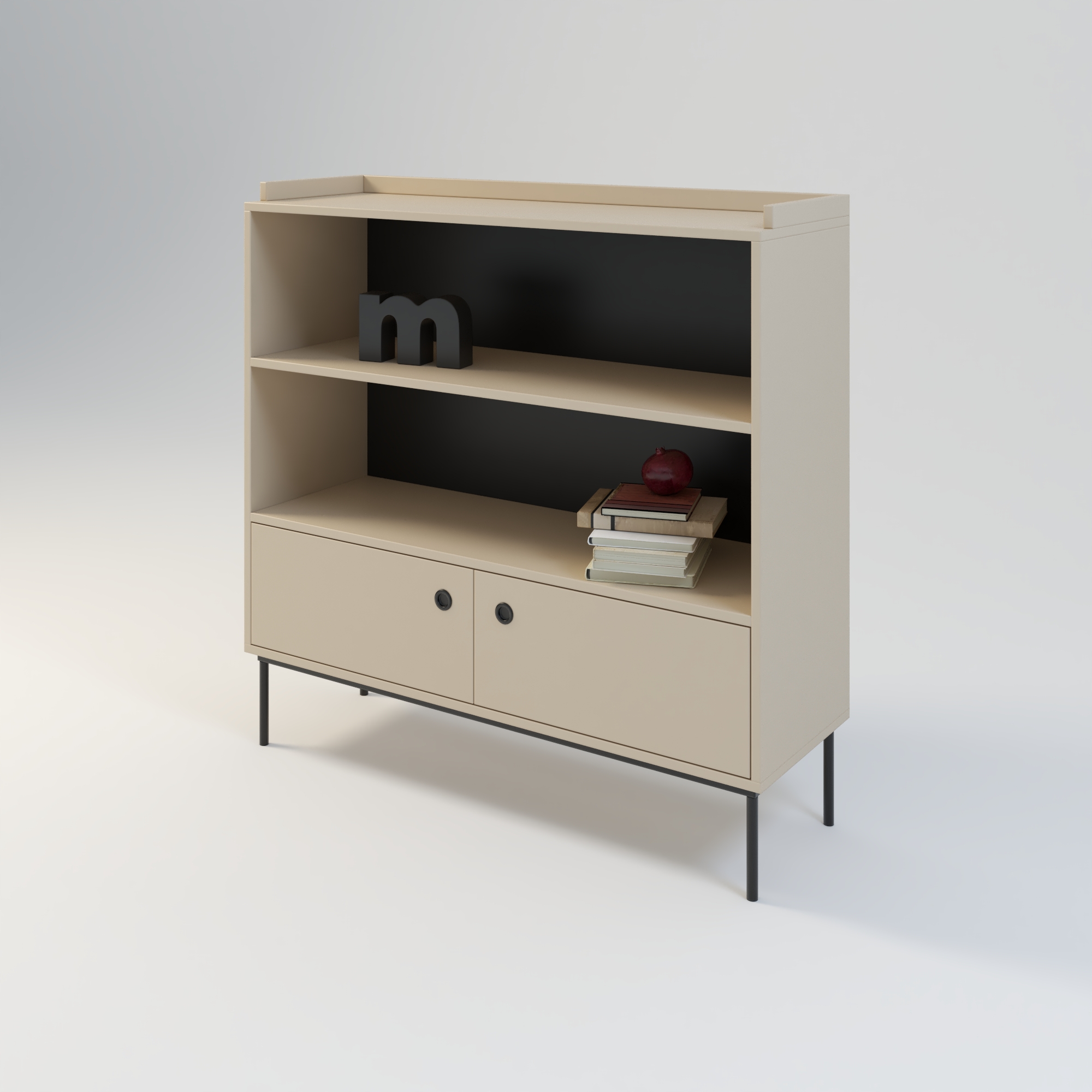 Nowoczesna komoda dedykowana do wnętrz w stylu minimalistycznym. Prosta w formie i bardzo funkcjonalna konstrukcja, oferuje dużą przestrzeń do przechowywania. Na górnych półkach możemy wyeksponować kolekcję książek, płyt lub oryginalne dekoracje i ozdoby. Szafka w całości wykonana z wysokiej jakości płyty laminowanej w kolorze beżowym o odcieniu piaskowym. Kolor ten doskonale sprawdza się w połączeniu z innymi kolorami.