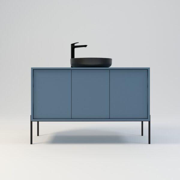 Ein minimalistischer Badezimmerschrank. Er wurde für alle entworfen, die Wert auf Schlichtheit und Eleganz legen. Die Türen sind in den Korpus eingelassen und lassen sich mit ausfallsicheren Scharnieren und einem Kippmechanismus öffnen. Der Schrank ist auch mit Türgriffen erhältlich. Er besteht vollständig aus hochwertiger Laminatplatte. Jedes Türfach verfügt über einen Einlegeboden. Die Breite des Schranks inklusive der Metallbeine beträgt 124 cm. Die Korpushöhe beträgt 54 cm. Die Höhe des Metallgestells/der Beine beträgt 26 cm. Verstellbare Füße ermöglichen ein präzises Ausrichten. Waschbecken nicht im Lieferumfang enthalten.