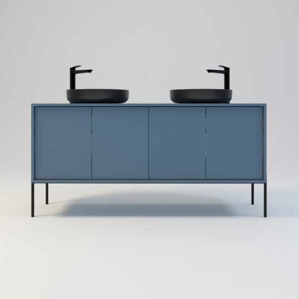Ein minimalistischer Badezimmerschrank. Er wurde für alle entworfen, die Wert auf Schlichtheit und Eleganz legen. Die Türen sind in den Korpus eingelassen und lassen sich mit ausfallsicheren Scharnieren und einem Kippmechanismus öffnen. Der Schrank ist auch mit Türgriffen erhältlich. Er besteht vollständig aus hochwertiger Laminatplatte. Jedes Türfach verfügt über einen Einlegeboden. Die Breite des Schranks inklusive der Metallbeine beträgt 164 cm. Die Korpushöhe beträgt 54 cm, die Höhe des Metallgestells/der Beine 26 cm. Verstellbare Füße sorgen für einen sicheren Stand. Der Schrank bietet Platz für zwei Waschbecken in beliebiger Anordnung: links, rechts oder symmetrisch. Waschbecken sind nicht im Lieferumfang enthalten.