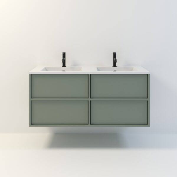Der wandhängende Badezimmerschrank Minimal 4 mit integriertem Waschbecken ist ein modernes Bad-Set, bestehend aus einem Schrank mit vier Schubladen und einem Doppelwaschbecken aus Keramik, das gleichzeitig als Waschtischplatte dient. Dieses Set ist eine besonders funktionale und langlebige Lösung. Dank des universellen Designs und der geometrischen Form fügt sich der Schrank perfekt in unterschiedlichste Einrichtungsstile ein.