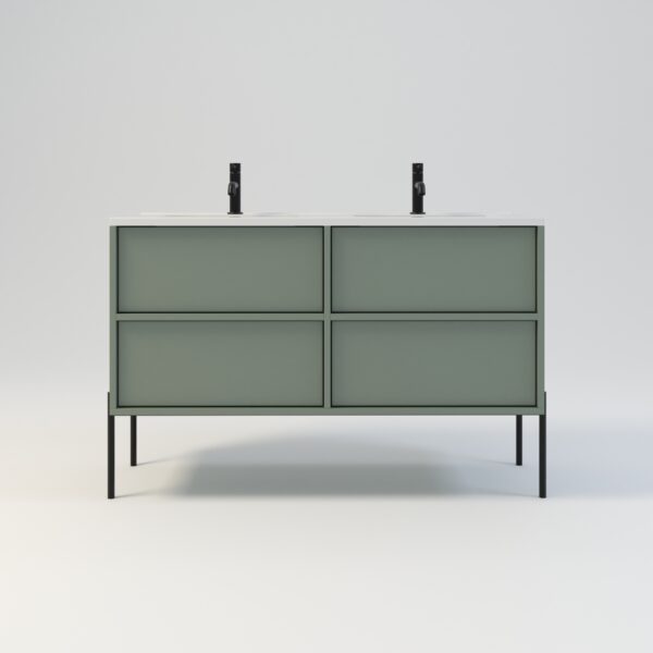 Der Minimal 4 Badezimmerschrank mit Waschbecken ist ein modernes Badezimmer-Set, bestehend aus einem Badezimmerschrank mit vier Schubladen und einem Doppelwaschbecken aus Keramik, das gleichzeitig als Waschtischplatte dient. Dieses Set ist eine außergewöhnlich funktionale und langlebige Lösung. Die Kombination aus universellem Stil und geometrischer Form macht den Schrank zur perfekten Ergänzung für verschiedenste Badezimmer. Er passt sowohl in moderne als auch in klassische Badezimmer. Dank der verschiedenen Farben und optionalen Griffe lässt sich das Möbelstück mühelos an Ihren Einrichtungsstil anpassen. Es ist die Kombination aus Schlichtheit und modernem Design, die nie aus der Mode kommt.