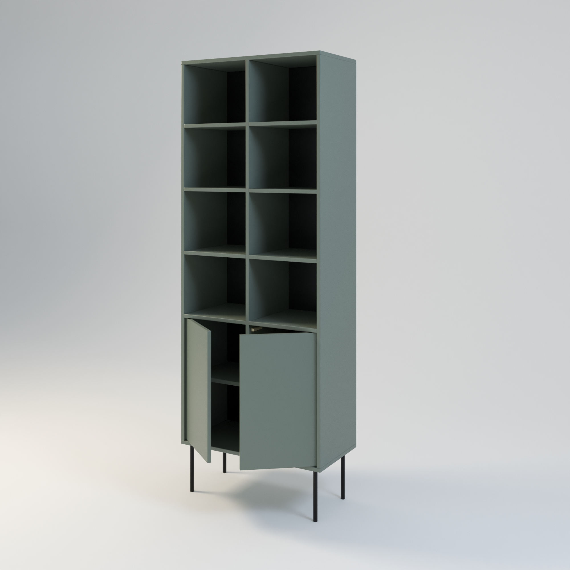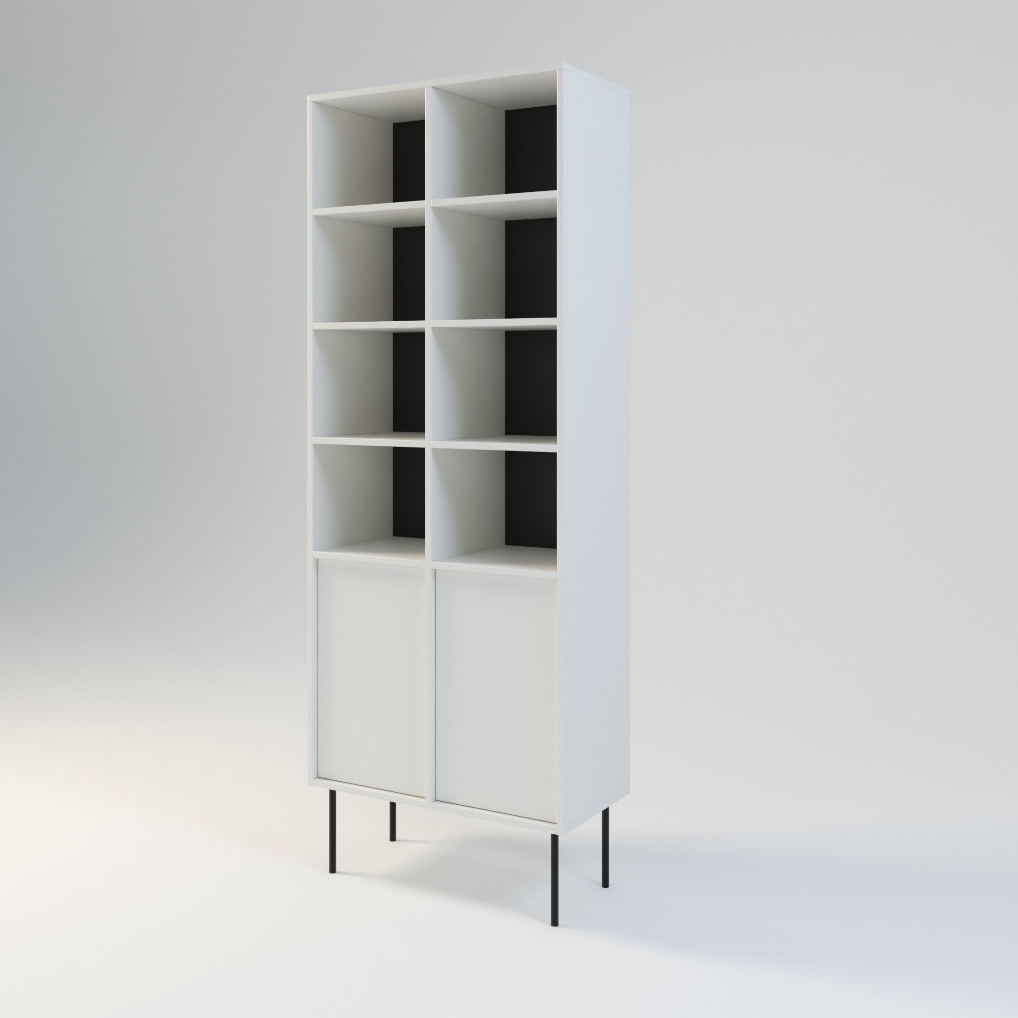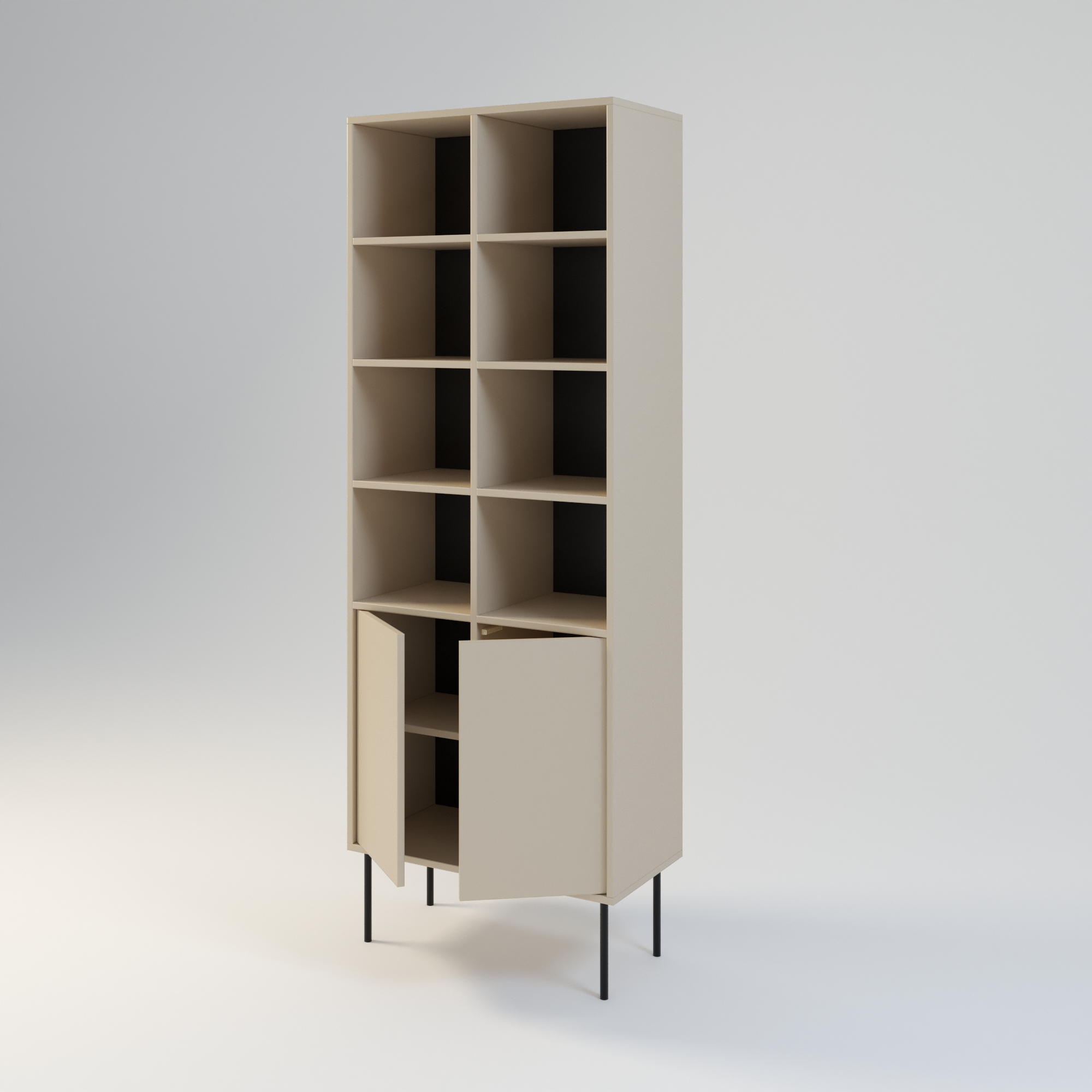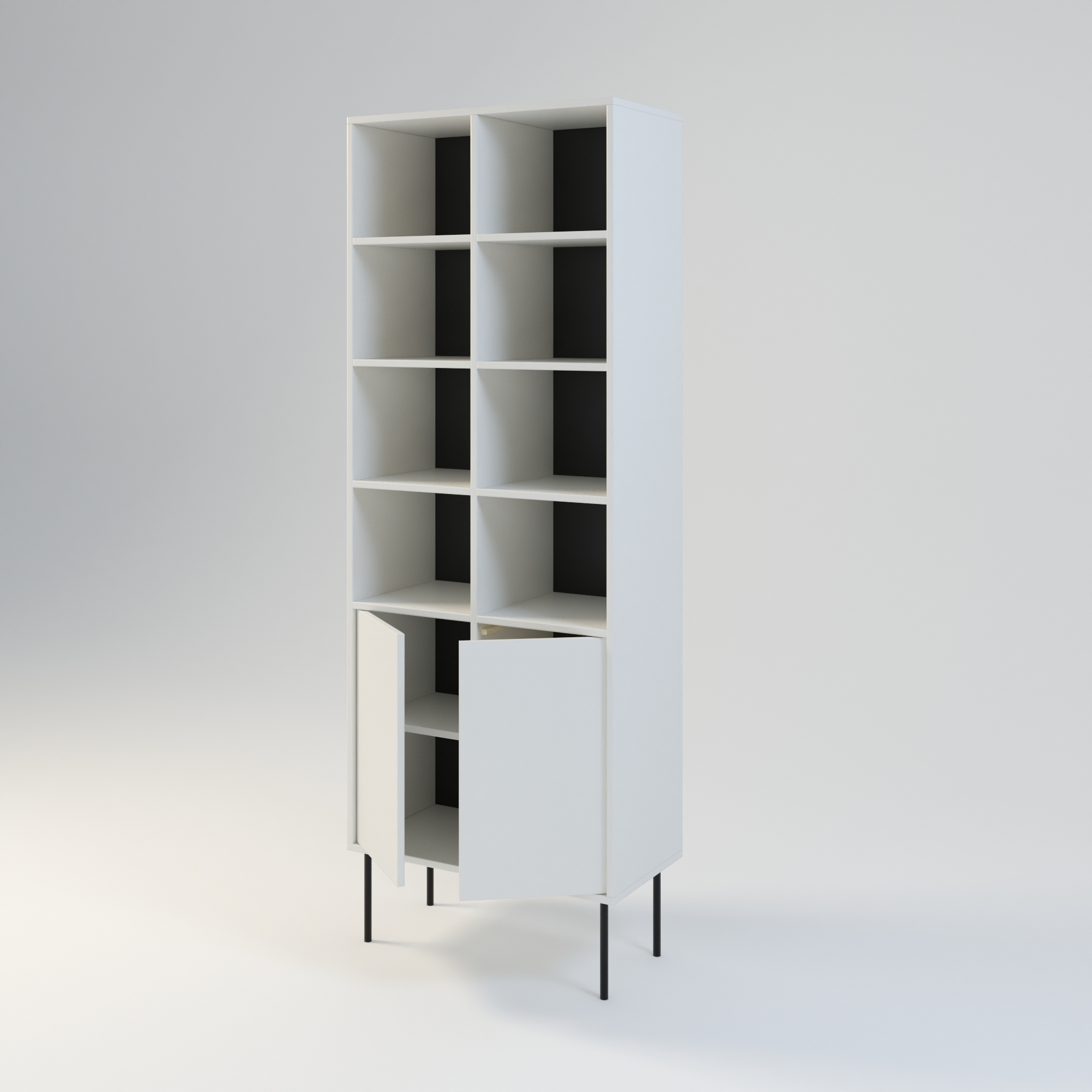 Minimalistyczny regał na książki. Prosty w formie, o bardzo funkcjonalnej konstrukcji. Oferuje dużą przestrzeń do przechowywania. Na półkach możemy wyeksponować własną kolekcję książek oraz oryginalne dekoracje i ozdoby. Drzwi wyposażone w zawiasy z cichym domykiem, otwierane za pomocą mechanizmu tip-on. Uchwyty drzwiowe dostępne jako dodatkowa opcja. Regał wyposażony w 6 półek. Wysokość półek w świetle to 31 cm. Regały można z sobą łączyć bokami, tworząc w ten sposób większe moduły. Nadaje się do modułowego łączenia z szafą Tara i regałem Ugo.