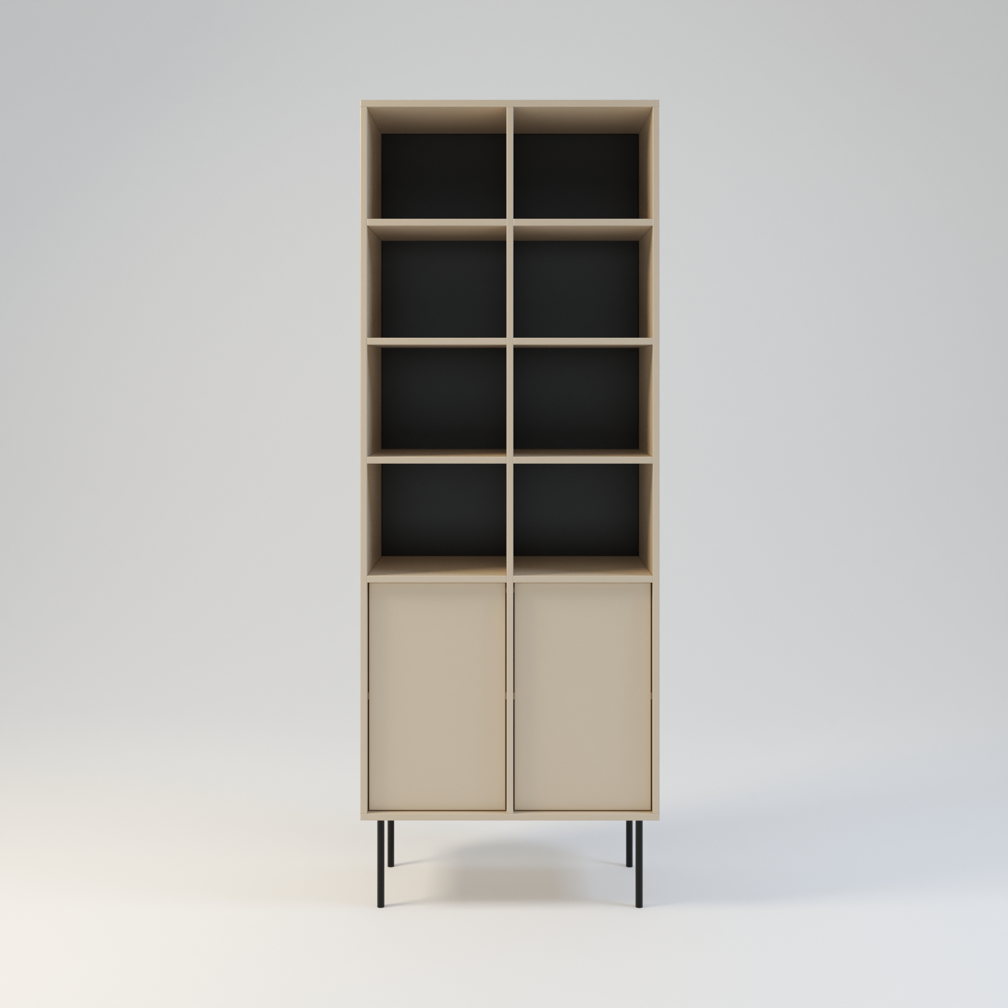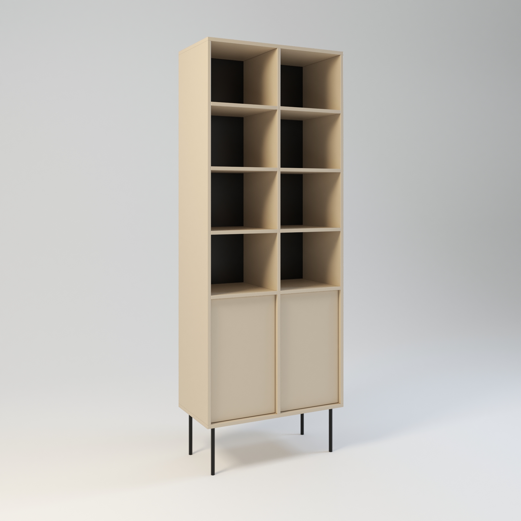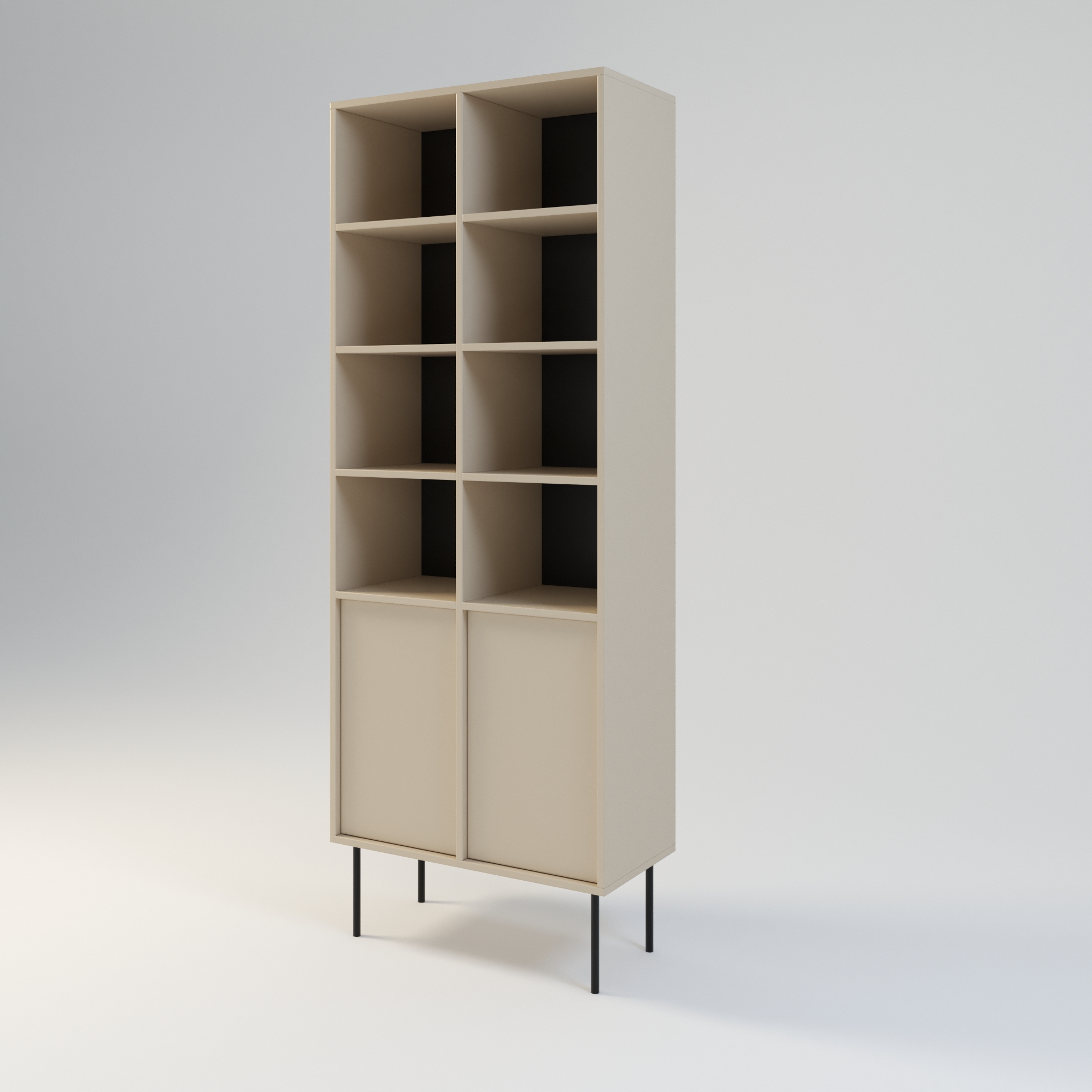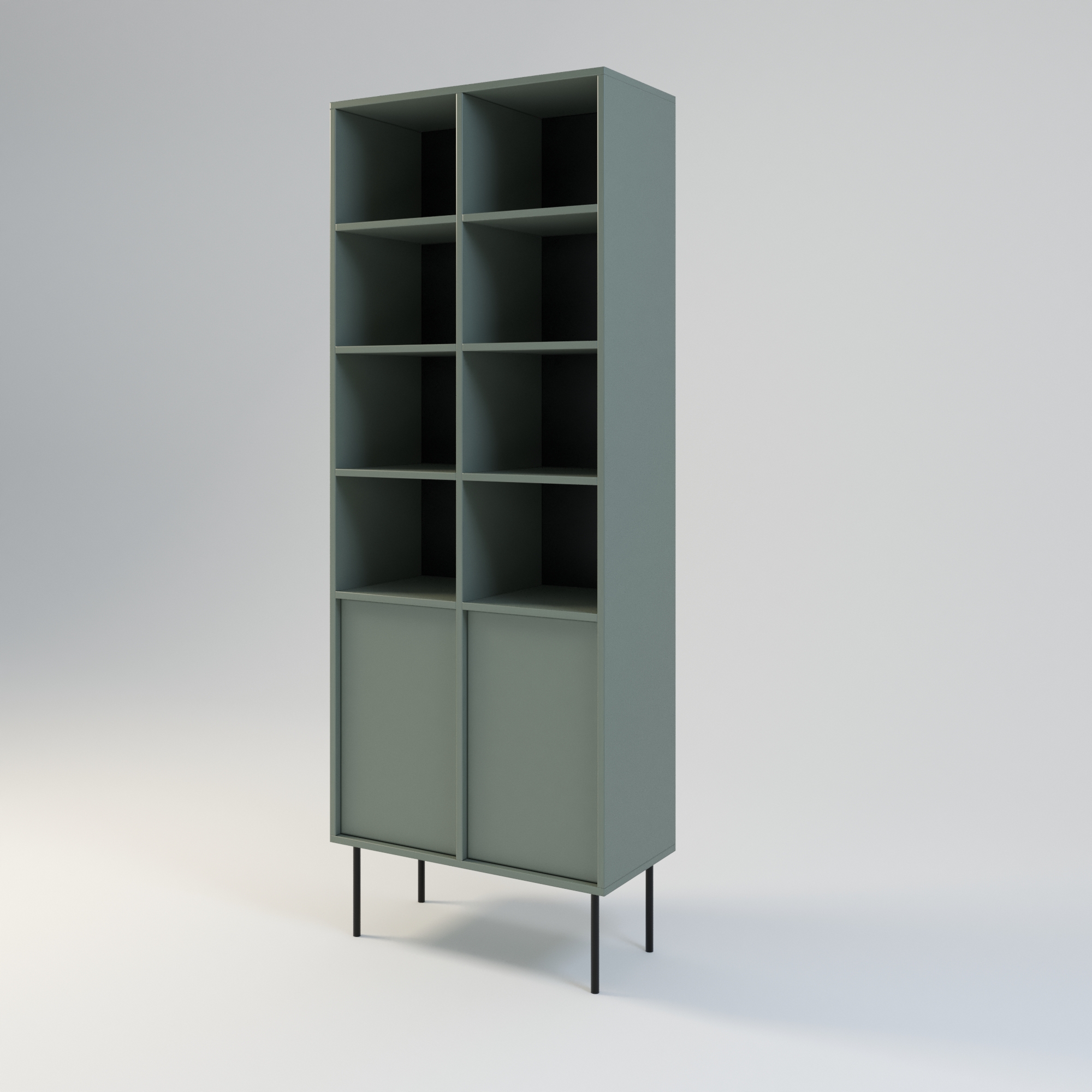 Minimalistyczny regał na książki. Prosty w formie, o bardzo funkcjonalnej konstrukcji. Oferuje dużą przestrzeń do przechowywania. Na półkach możemy wyeksponować własną kolekcję książek oraz oryginalne dekoracje i ozdoby. Drzwi wyposażone w zawiasy z cichym domykiem, otwierane za pomocą mechanizmu tip-on. Uchwyty drzwiowe dostępne jako dodatkowa opcja. Regał wyposażony w 6 półek. Wysokość półek w świetle to 31 cm. Regały można z sobą łączyć bokami, tworząc w ten sposób większe moduły. Nadaje się do modułowego łączenia z szafą Tara i regałem Ugo.
