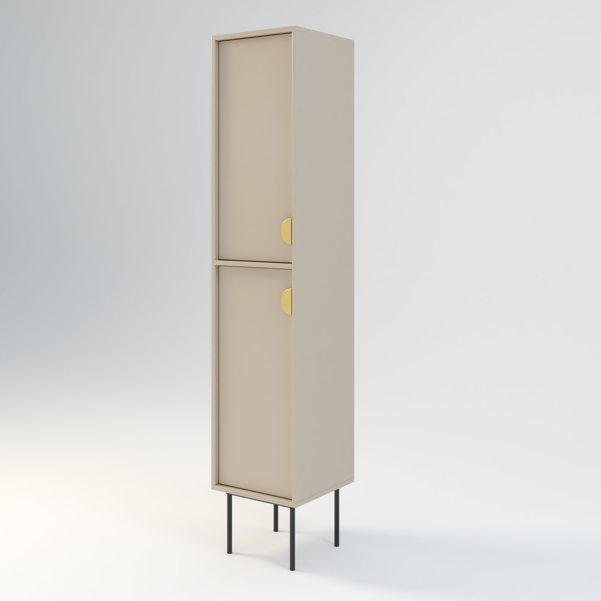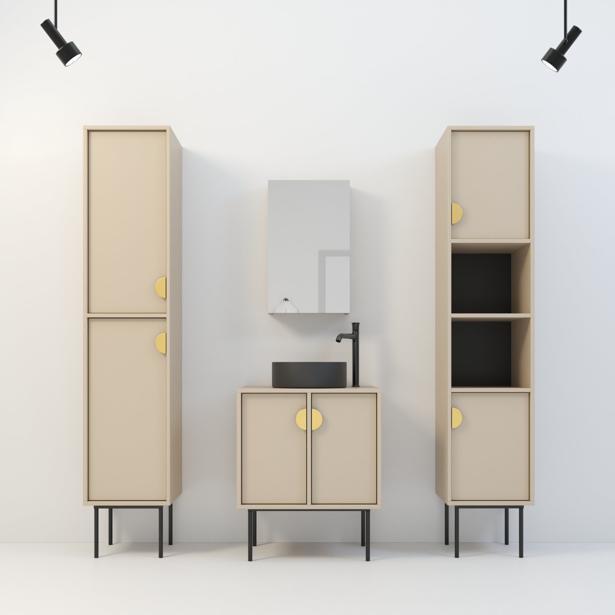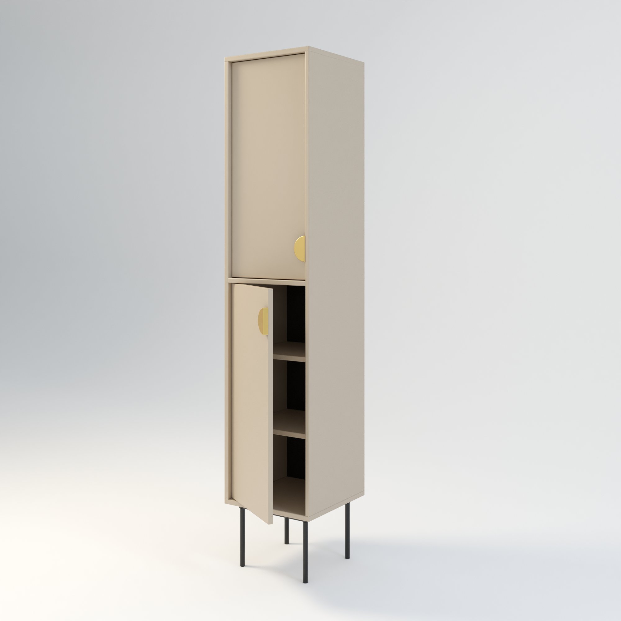 Słupek łazienkowy w stylu japandi. Zaprojektowany z myślą o osobach ceniących sobie prostotę i elegancję. Drzwi wpuszczone w korpus, otwierane za pomocą bezawaryjnych zawiasów. W ramach opcji konfiguracji drzwiczki mogą być otwierane na stronę lewą lub prawą. Funkcjonalna konstrukcja oferuje dużą przestrzeń do przechowywania. Szafka w całości wykonana z wysokiej jakości płyty laminowanej. Wysokość korpusu słupka to 175 cm. Wysokość metalowych nóg to 25 cm.