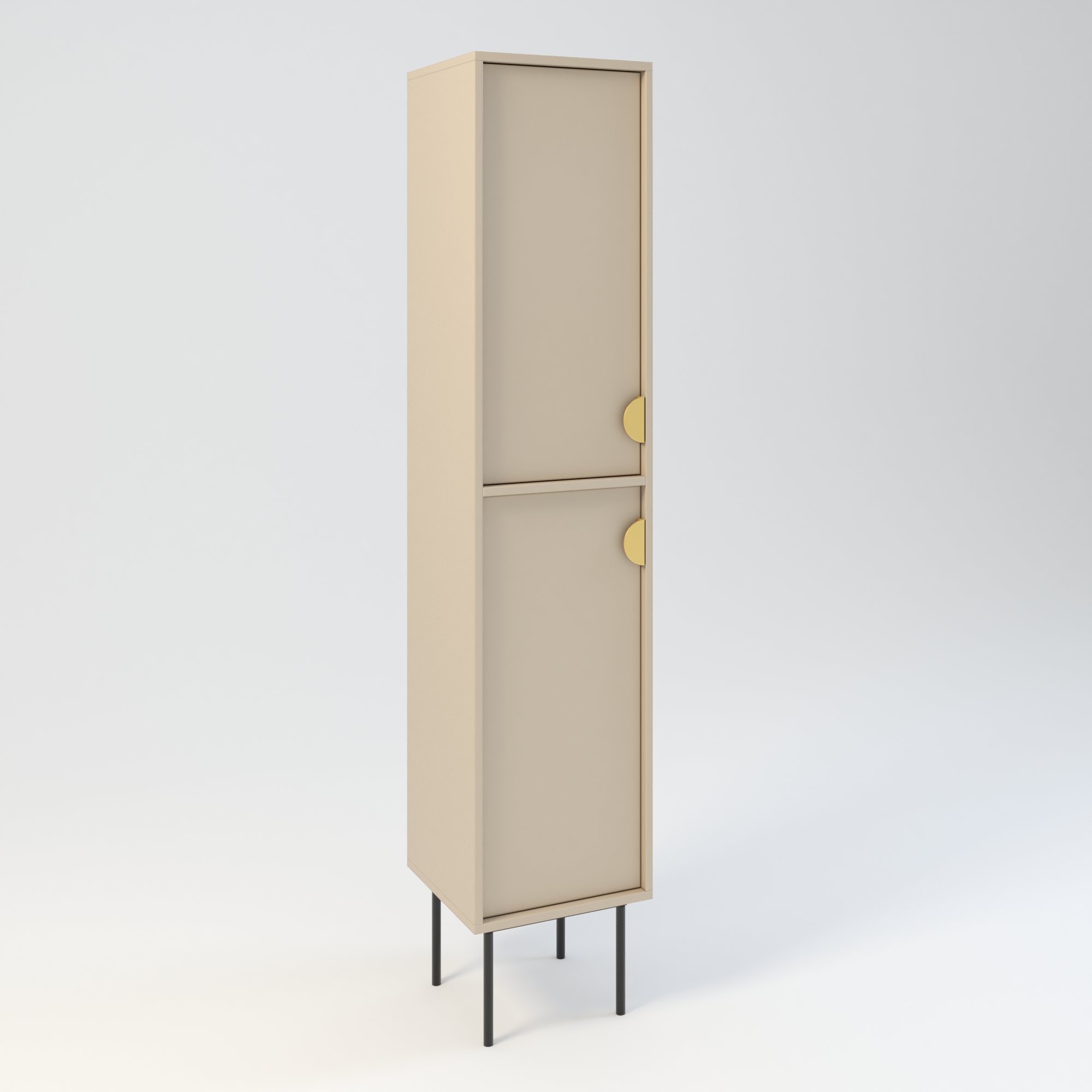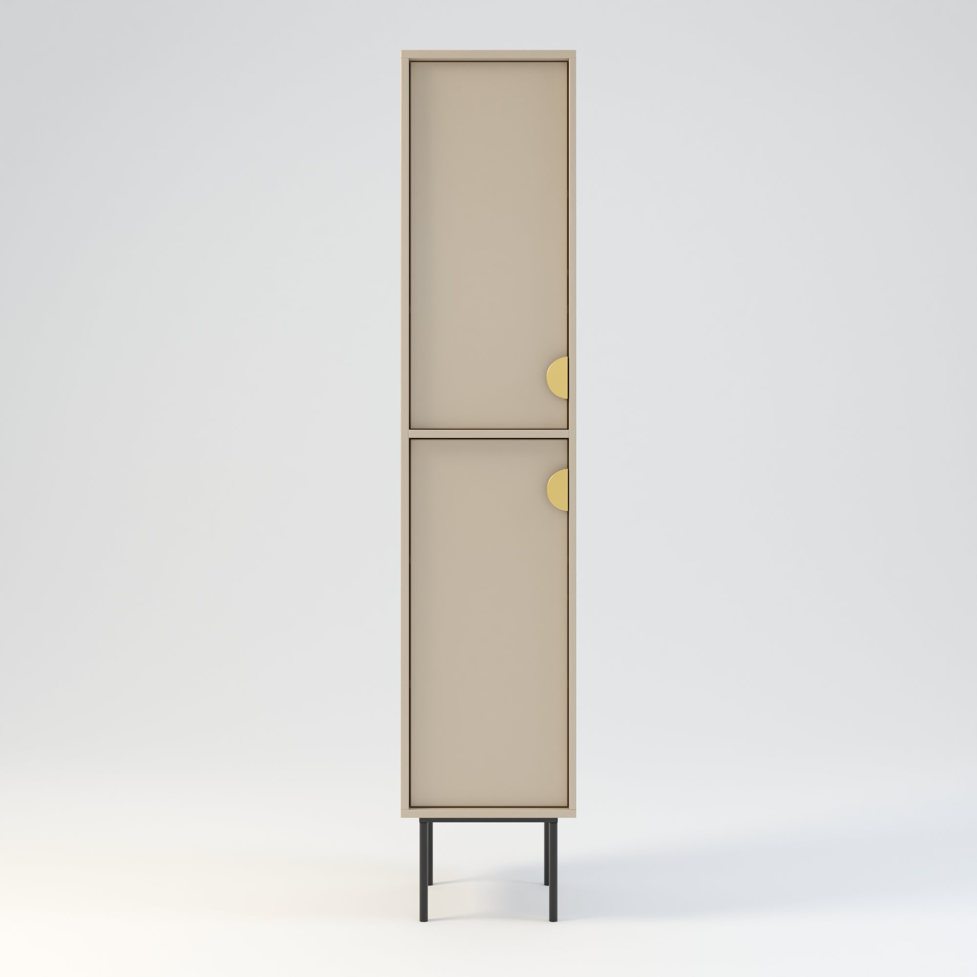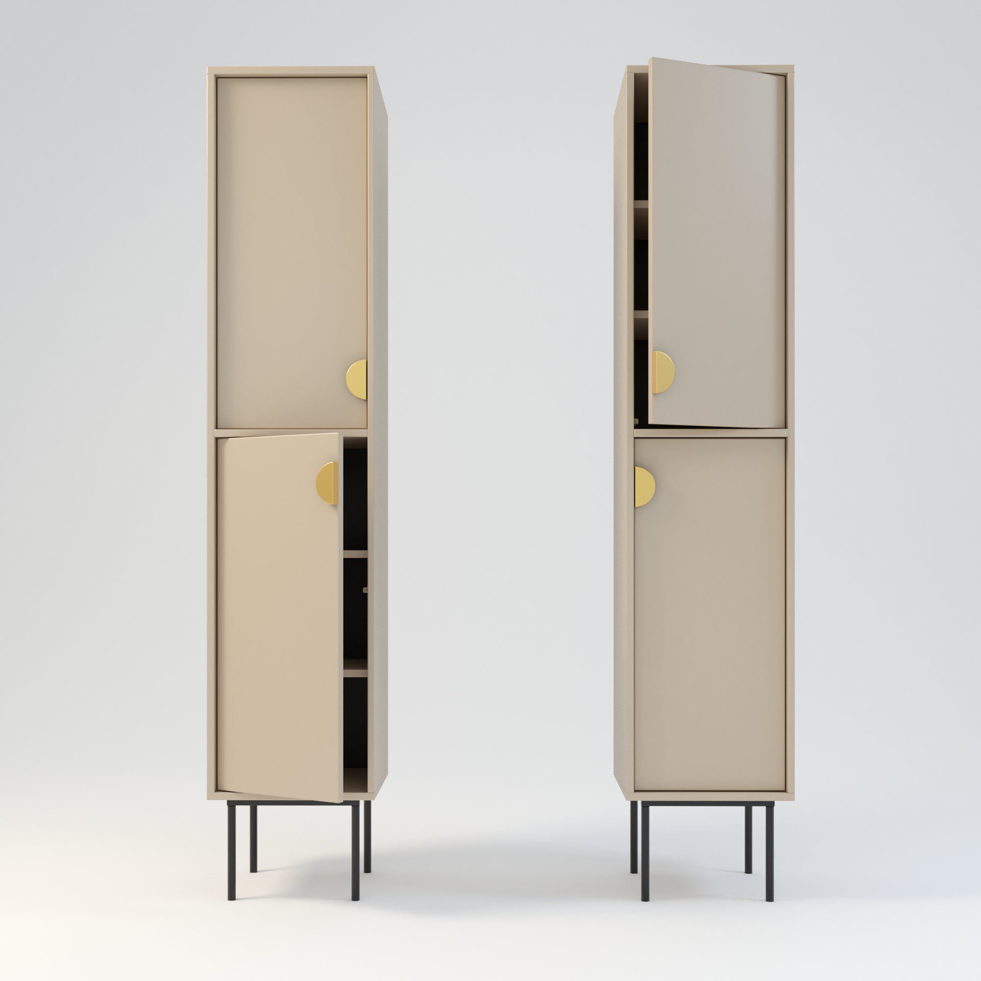 Słupek łazienkowy w stylu japandi. Zaprojektowany z myślą o osobach ceniących sobie prostotę i elegancję. Drzwi wpuszczone w korpus, otwierane za pomocą bezawaryjnych zawiasów. W ramach opcji konfiguracji drzwiczki mogą być otwierane na stronę lewą lub prawą. Funkcjonalna konstrukcja oferuje dużą przestrzeń do przechowywania. Szafka w całości wykonana z wysokiej jakości płyty laminowanej. Wysokość korpusu słupka to 175 cm. Wysokość metalowych nóg to 25 cm.