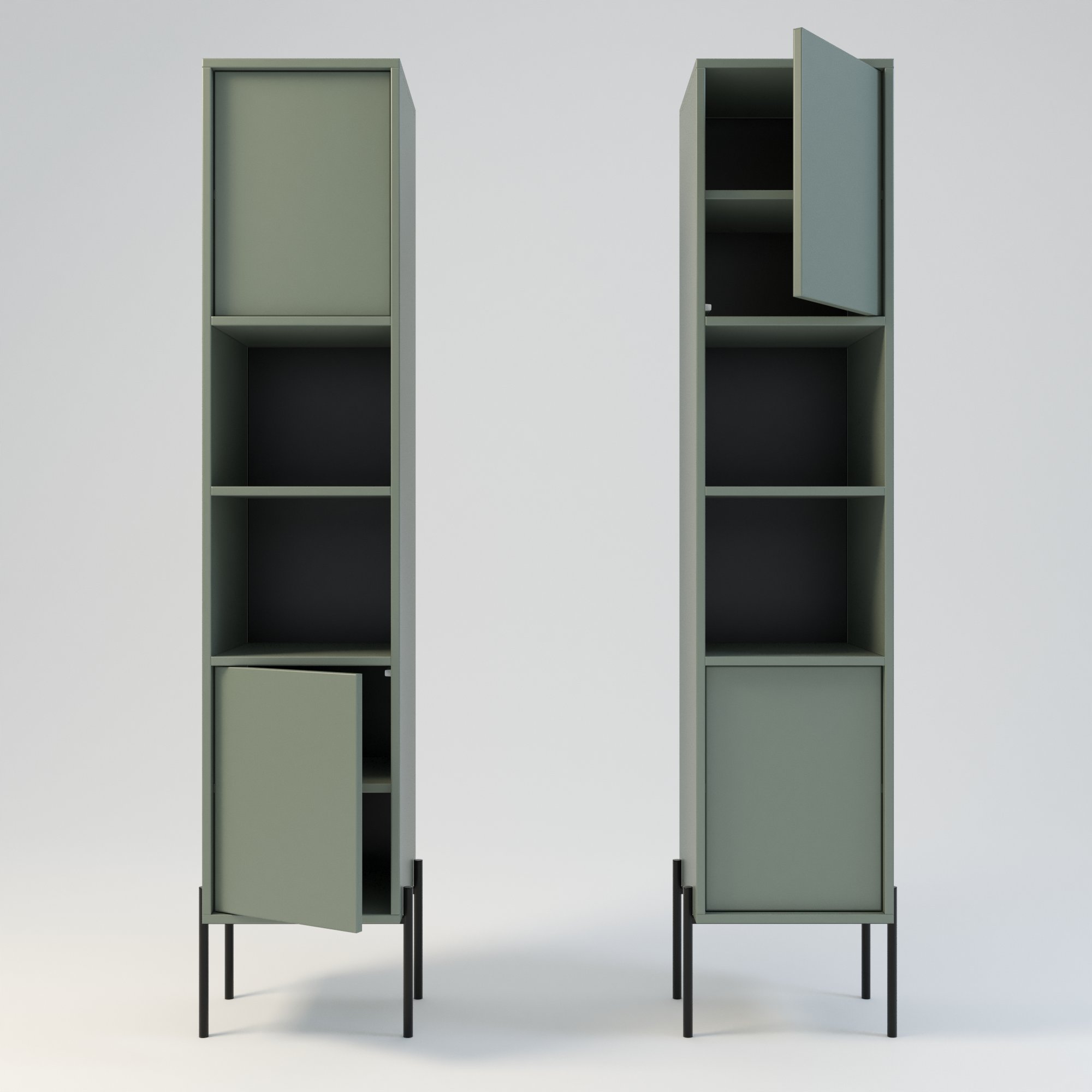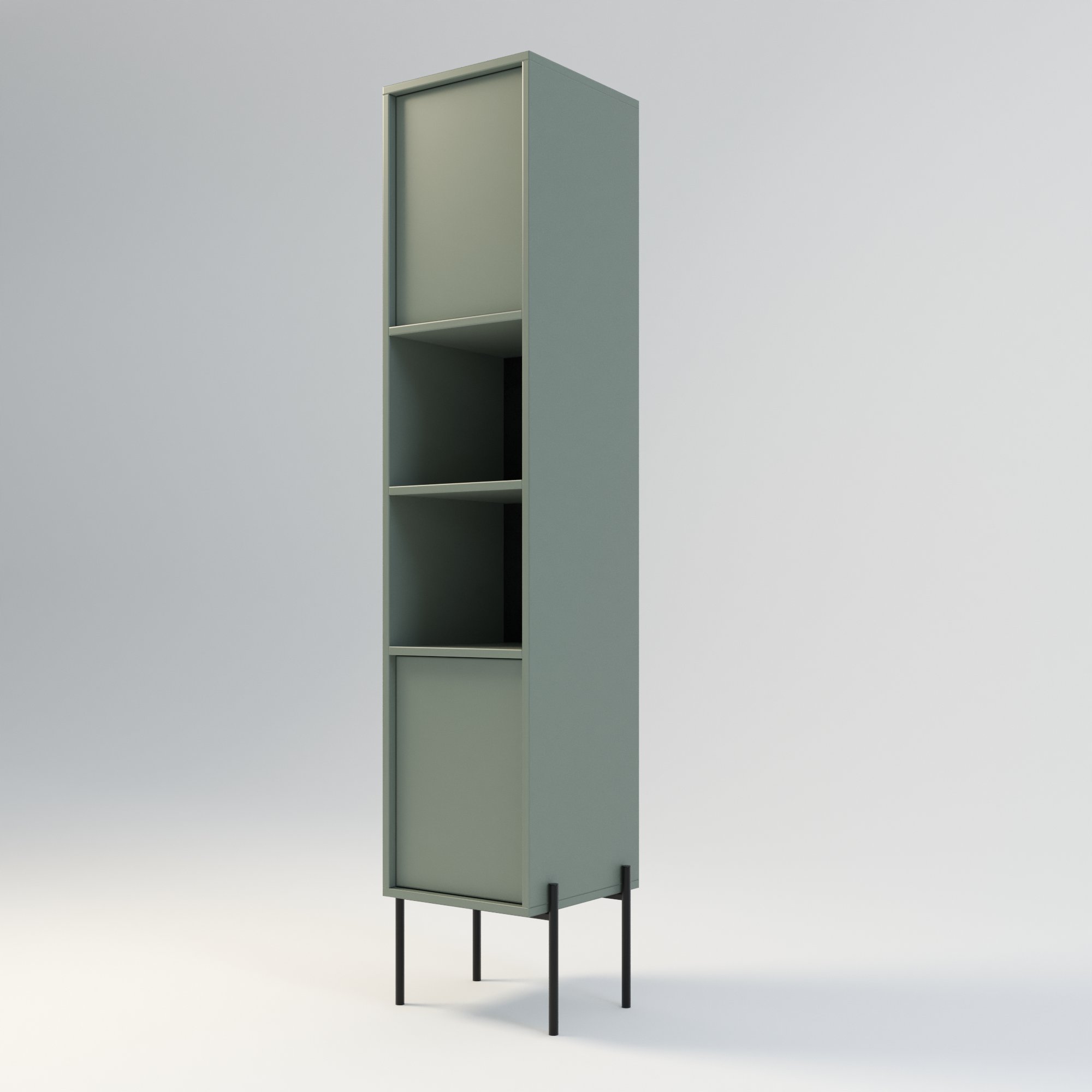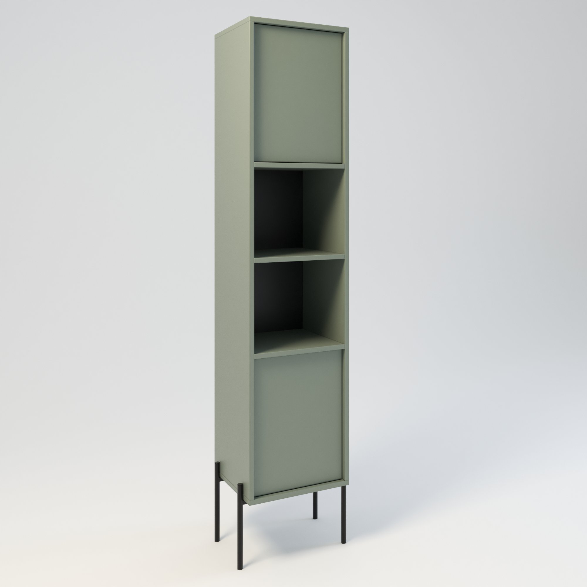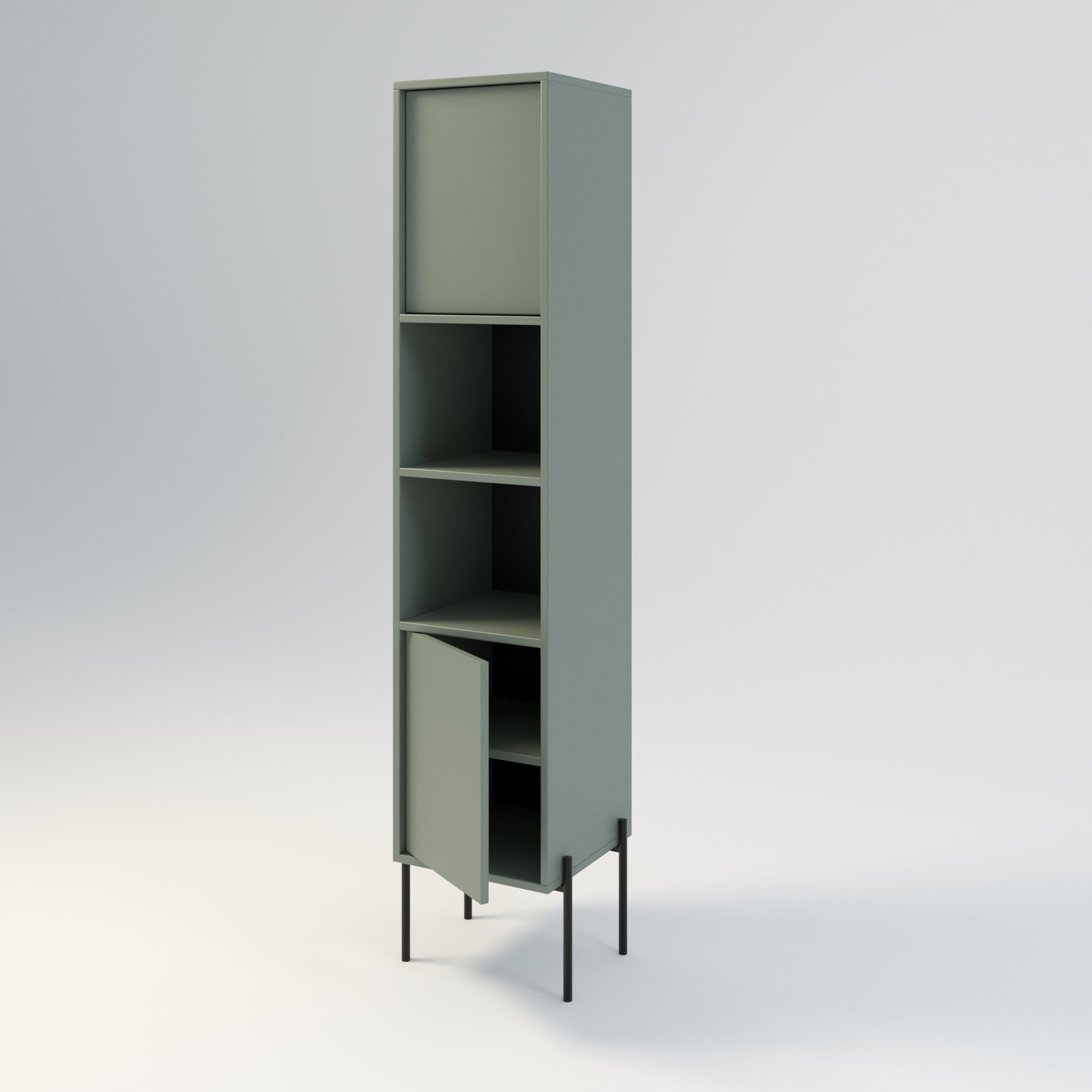Słupek łazienkowy w stylu minimalistycznym. Zaprojektowany z myślą o osobach ceniących sobie prostotę i elegancję. Drzwi wpuszczone w korpus, otwierane za pomocą mechanizmu tip on. Istnieje również możliwość zamontowania starannie wyselekcjonowanych uchwytów drzwiowych. Drzwi mogą być otwierane na stronę lewą lub prawą. Funkcjonalna konstrukcja oferuje dużą przestrzeń do przechowywania. Posiada 2 otwarte półki. Słupek w całości wykonany z wysokiej jakości płyty laminowanej. Korpus słupka ma wysokość 175 cm, natomiast metalowy stelaż 25 cm. Szerokość słupka razem z nogami metalowymi wynosi odpowiednio 34 cm i 44 cm
