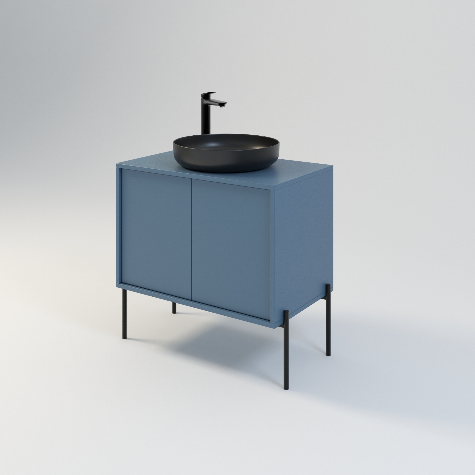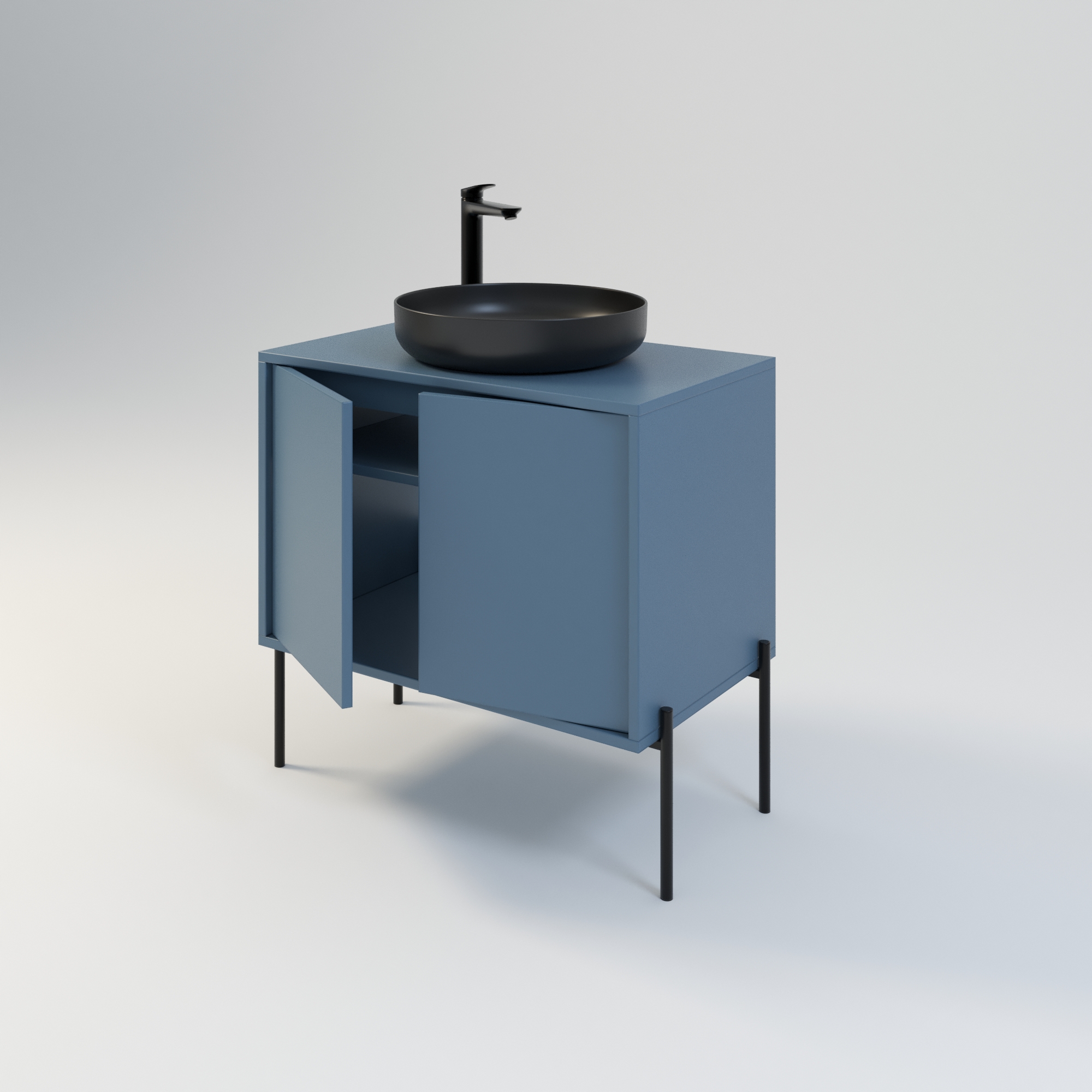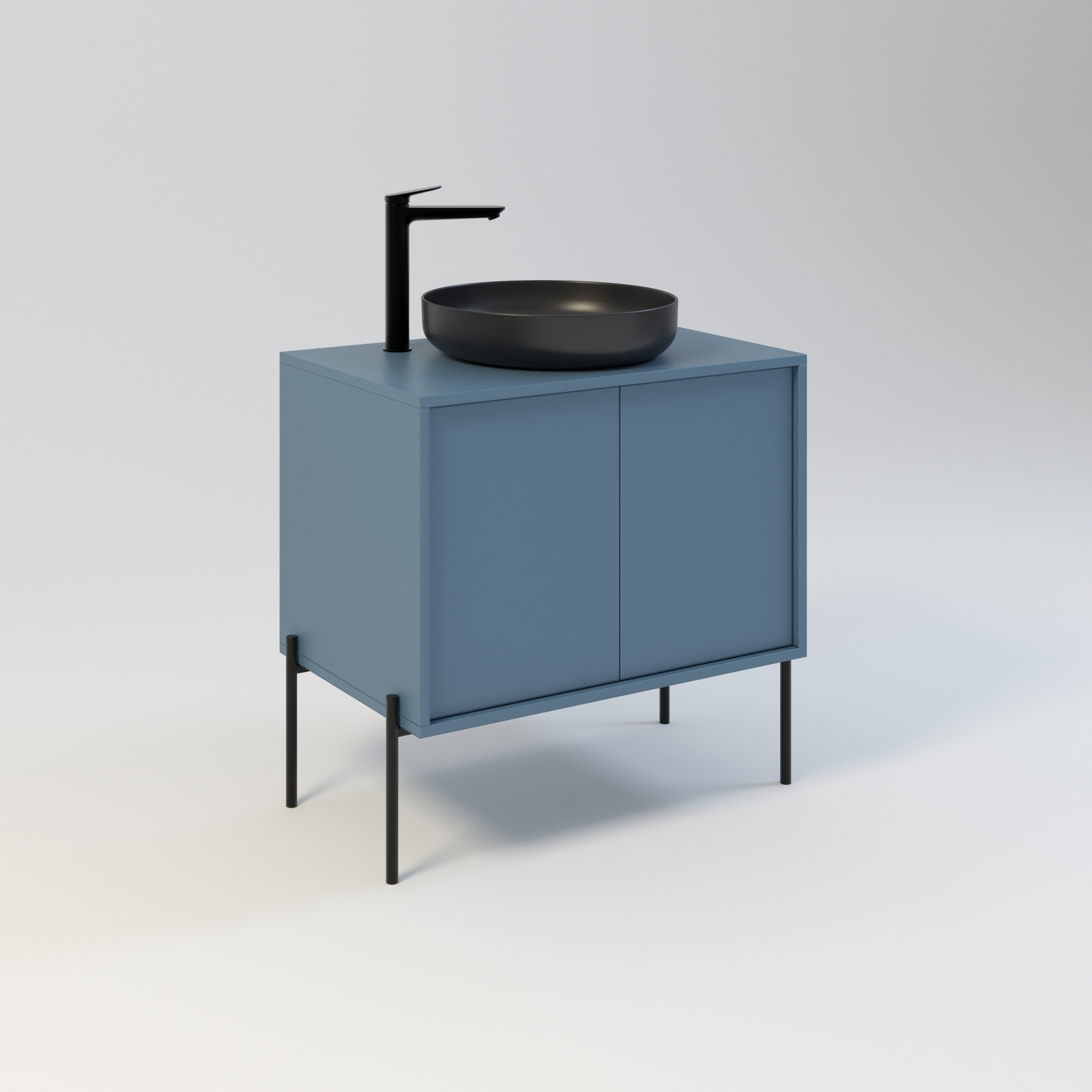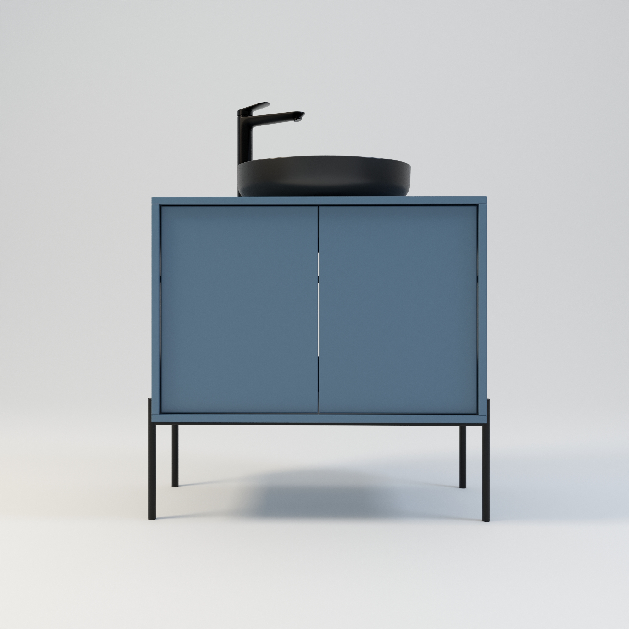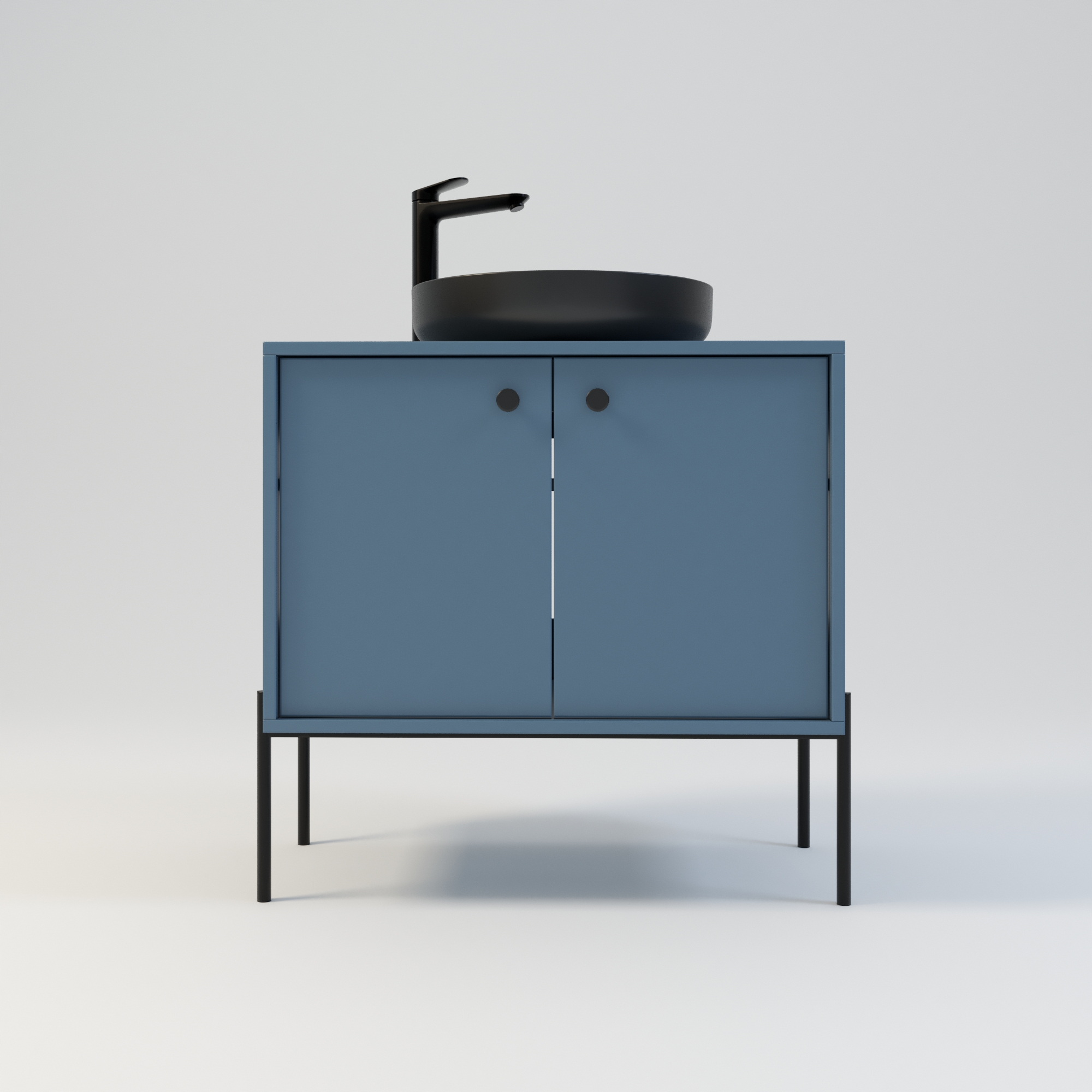 Szafka łazienkowa w stylu minimalistycznym. Zaprojektowana z myślą o osobach ceniących sobie prostotę i elegancję. Drzwi wpuszczone w korpus, otwierane za pomocą bezawaryjnych zawiasów i mechanizmu tip on. Szafka dostępna jest również w opcji z uchwytami drzwiowymi. Szafka w całości wykonana z wysokiej jakości płyty laminowanej. Wewnątrz jedna półka. Stelaż szafki wystaje bokami 2 cm poza obrys korpusu szafki. Wysokość korpusu szafki to 54 cm. Wysokość stelaża metalowego / nóg to 26 cm. Umywalka nie wchodzi w skład zestawu.