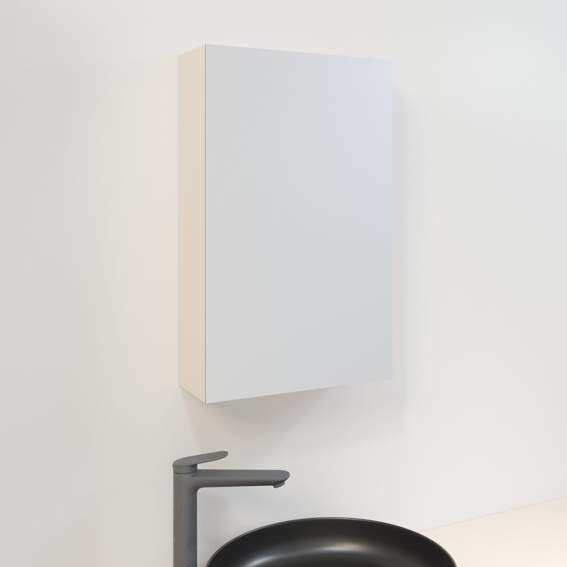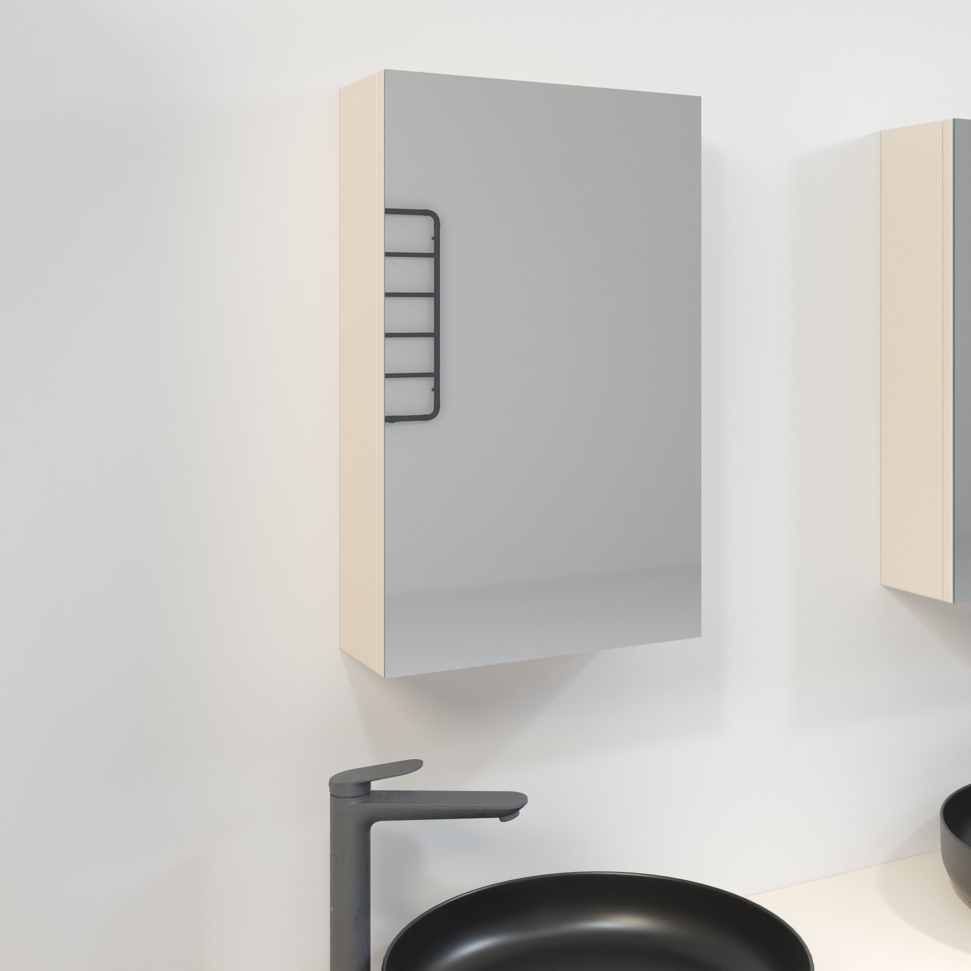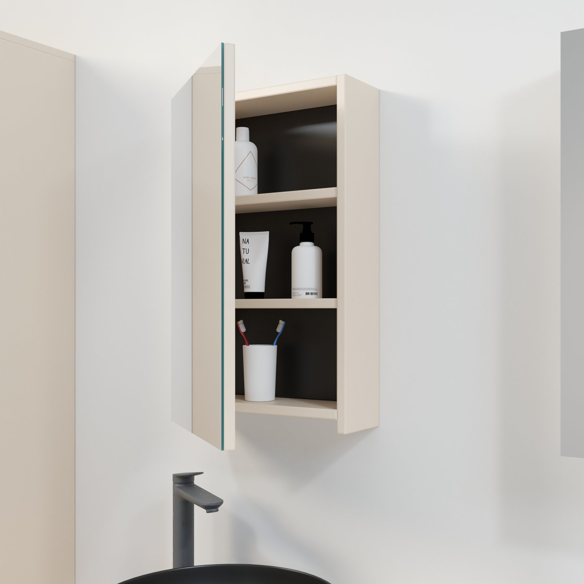 Szafka wisząca z lustrem w stylu minimalistycznym. Zaprojektowana z myślą o osobach ceniących sobie prostotę i elegancję. Szafki Kobe można łączyć ze sobą bokami, tworząc w ten sposób większe moduły wiszącą składające się z 2-3 szafek. W ramach opcji konfiguracji drzwiczki mogą być otwierane na stronę lewą lub prawą. Lustro w kolorze srebrnym. Funkcjonalna konstrukcja oferuje dużą przestrzeń do przechowywania. Szafka w całości wykonana z wysokiej jakości płyty laminowanej. Drzwi wyposażone w zawiasy z cichym domykiem.